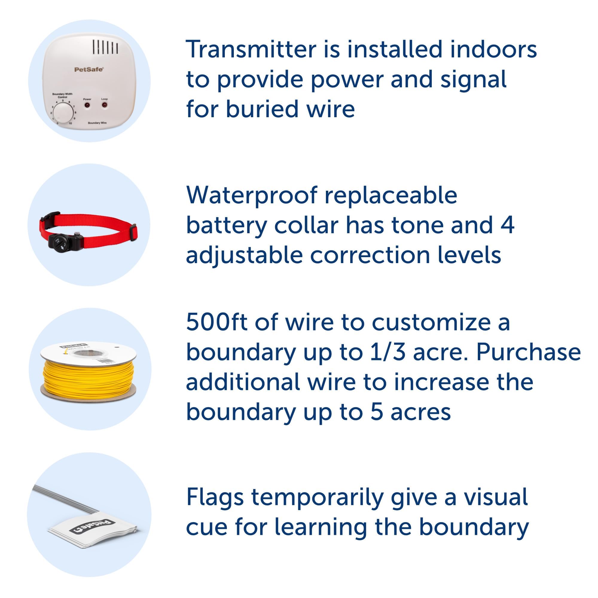 - Easy DIY Installation: The Basic In-Ground Fence System contains an indoor transmitter, boundary flags, and customizable settings for a weekend DIY setup; covers up to 1/3 acre with included wire
