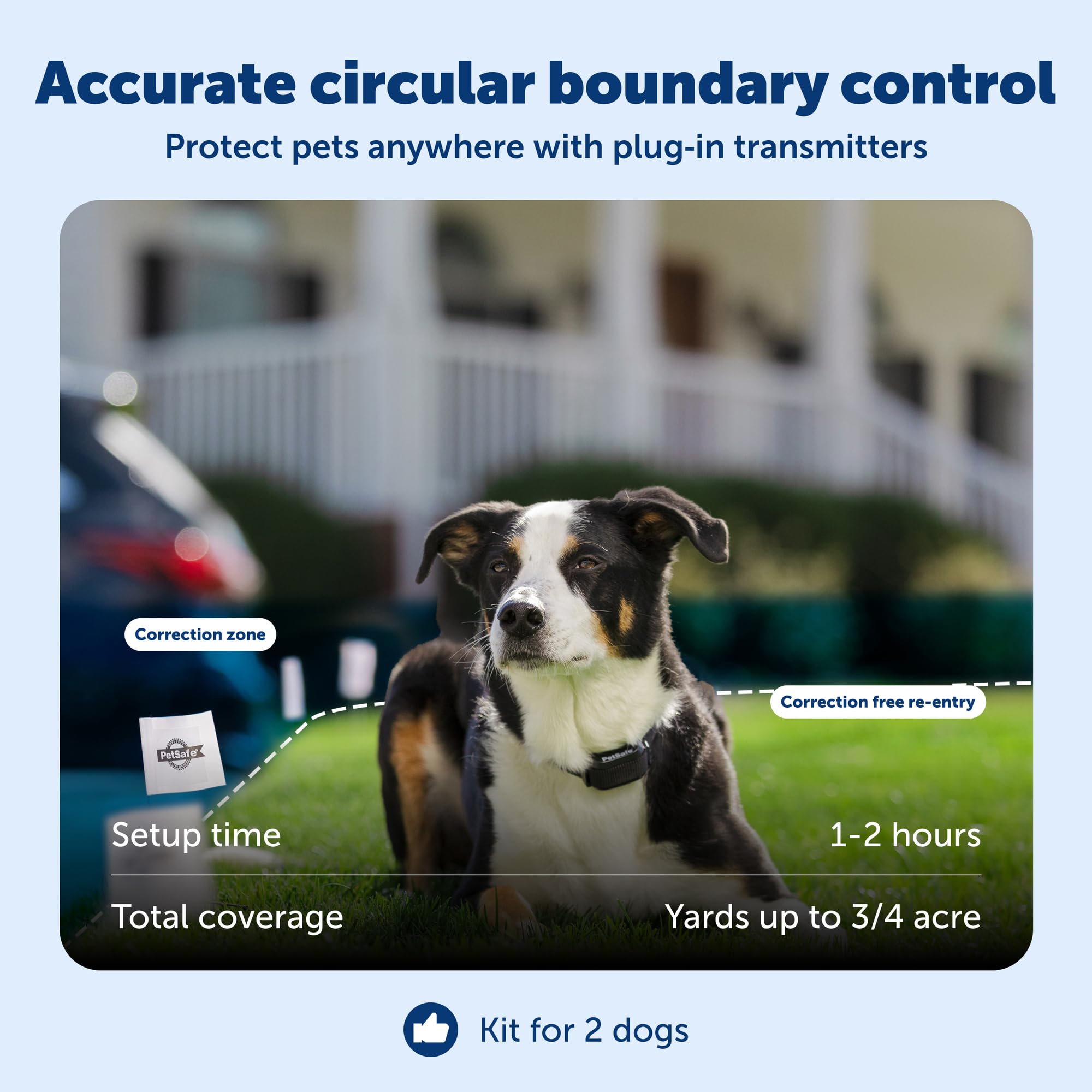 - Wireless Freedom: The PetSafe Stay & Play 2-Dog Wireless Fence is a lightweight, travel-friendly system that sets up in 1-2 hours with a circular boundary covering up to 3/4 acre; no digging required